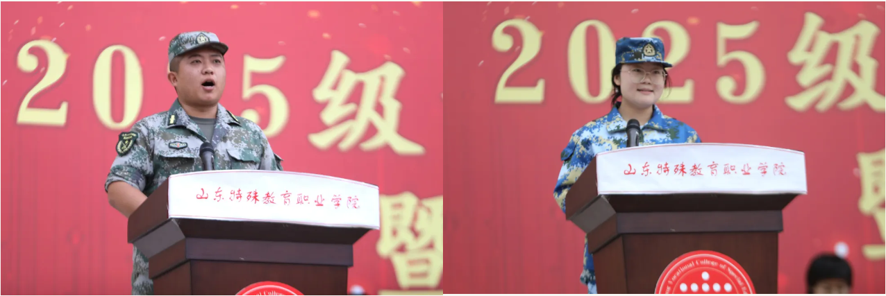 学院艺术设计系2025级新生宋佳欣作为新生代表发言。她以真挚的情感表达了对大学生活的期待与对军训的向往,承诺全体新生将以积极饱满的态度投入军训,以青春之姿展现2025级新生的朝气与担当,不辜负学院与教官的期望。