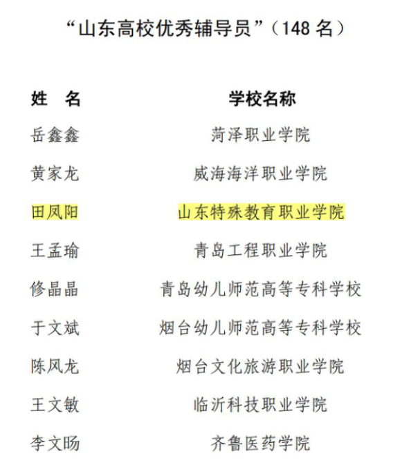 近日,山东省教育厅(省委教育工委)公布了2024年山东“十佳百优”学校思政课教师和高校辅导员评选结果。学院特殊教育系团总支书记、辅导员田凤阳获评“山东高校优秀辅导员”荣誉称号。