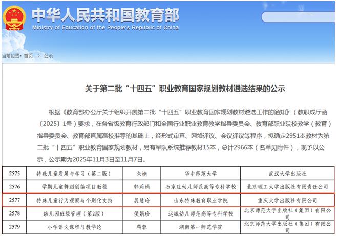 近日,教育部职业教育与成人教育司公示的第二批“十四五”职业教育国家规划教材遴选结果正式发布,我们特殊教育系教师展慧玲主编的《特殊儿童行为观察与个别化支持》教材成功入选,这是我们在特殊教育专业教材建设领域的又一重要突破,为特殊教育人才培养与行业发展提供了优质教学资源支撑。