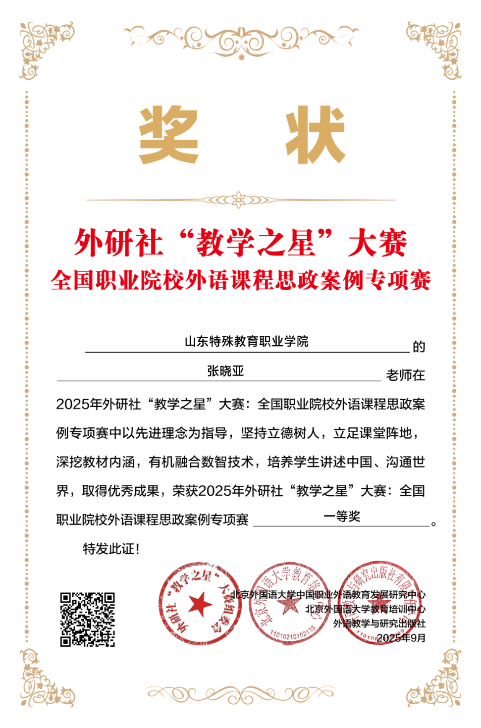 近日,2025年外研社“教学之星”大赛全国职业院校外语课程思政案例专项赛获奖名单公布。我们公共教学部张晓亚教师凭借出色的课程思政教学案例,在全国众多参赛教师中脱颖而出,荣获全国一等奖。