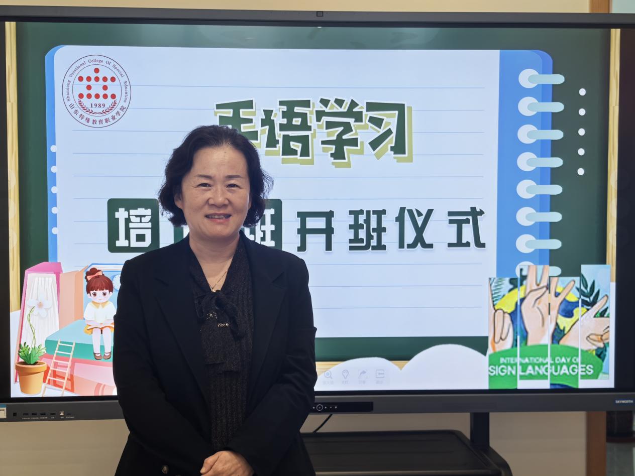 顾丽霞在致辞中,从个人、学校、社会发展三个层面阐述手语学习的重要性。她指出,于个人而言,作为特教老师的核心技能,手语是连接听障学生的重要桥梁,体现教育的人文关怀;从学校层面看,建设高水平手语教师队伍,是提升教学质量、打造学院特色的关键举措;放眼社会,推广手语是推动信息无障碍环境建设、促进社会公平包容的重要举措。她勉励全体参训人员要珍惜学习机会,将“指随心动”的理念内化于心、外化于行,成为学生成长路上的专业引路人。