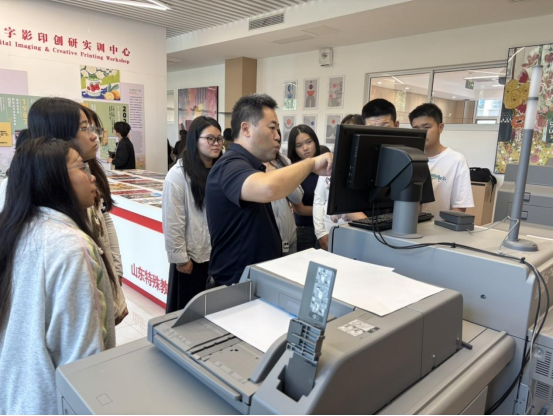 在实训现场,企业导师首先针对数字影印的全流程开展教学工作,着重演示了专业的图像采集技巧以及数码印刷机的色彩校准流程。企业导师一边调节设备参数,一边讲解专业原理,指出“需留意色靶测试条的CMYK四色叠印效果,此效果直接影响最终的输出质量”,并指导学生借助高精度扫描来获取图像素材,随后运用图像分析软件进行质量检测。学生们以小组形式进行实操,在导师的指导下,完成从图像采集、校色处理直至数码打样的完整工作流程,亲身体验专业设备在色彩还原度和细节表现力方面的技术优势。